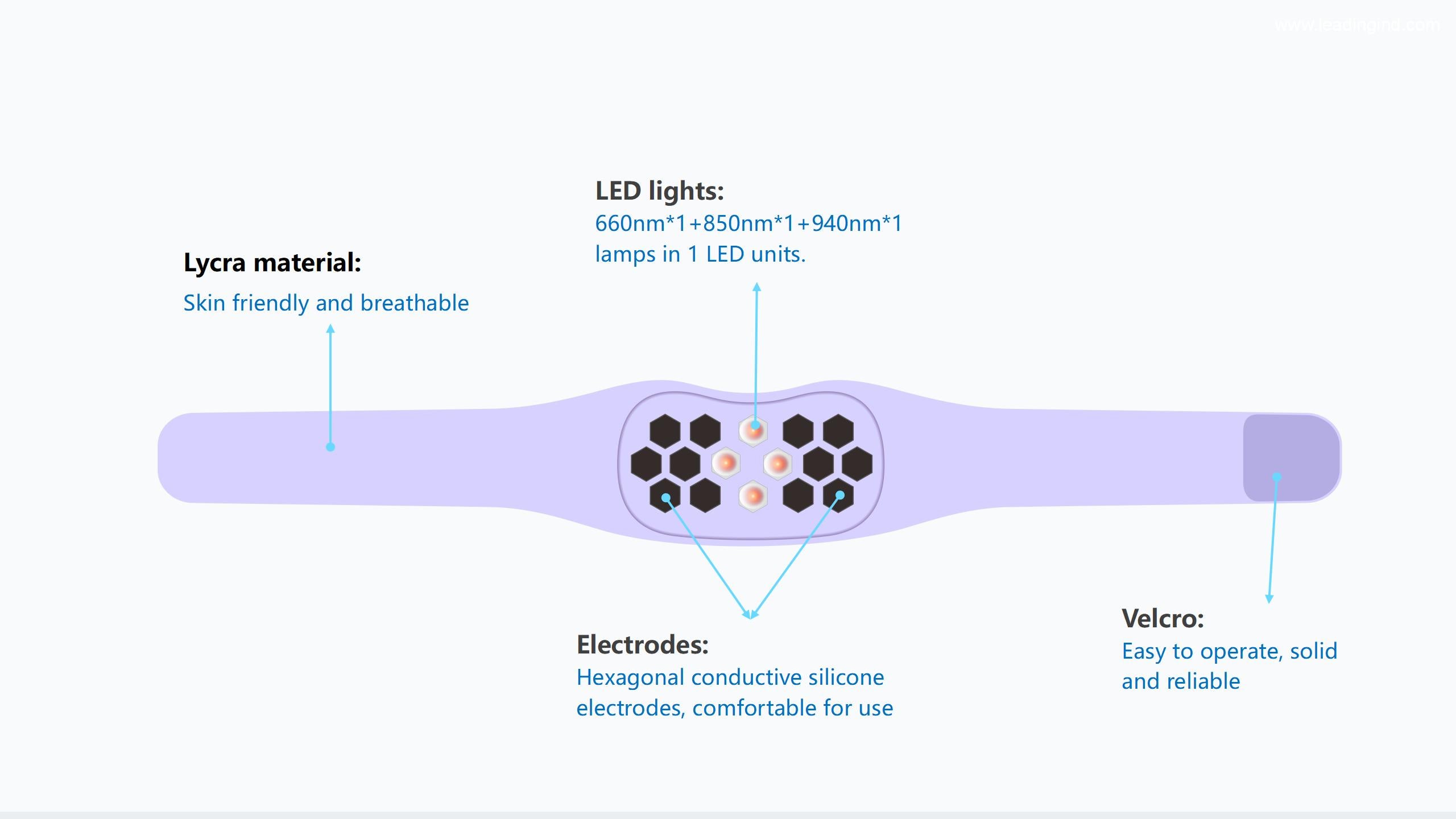 Our LED unit is included the most widely use of lights, 660nm visable light and 850/940nm infrared light is good for pain relief, delay the development of muscle fatigue, Enhance muscle performance, and helps wound heal etc.