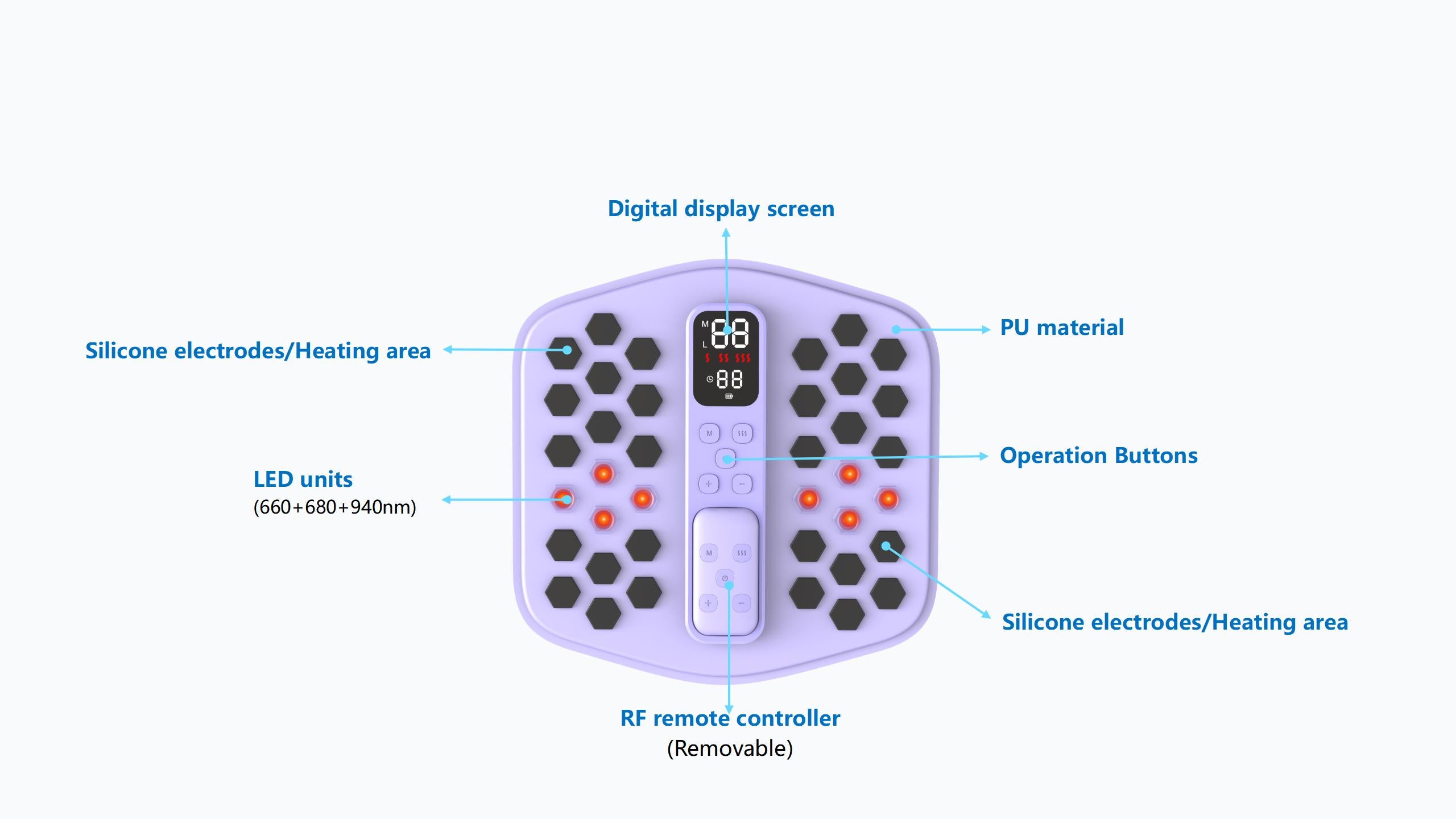 Hexagonal conductive silicone electrodes: comfortable and fully fit the skin with perfect contact and no gel pads needed.