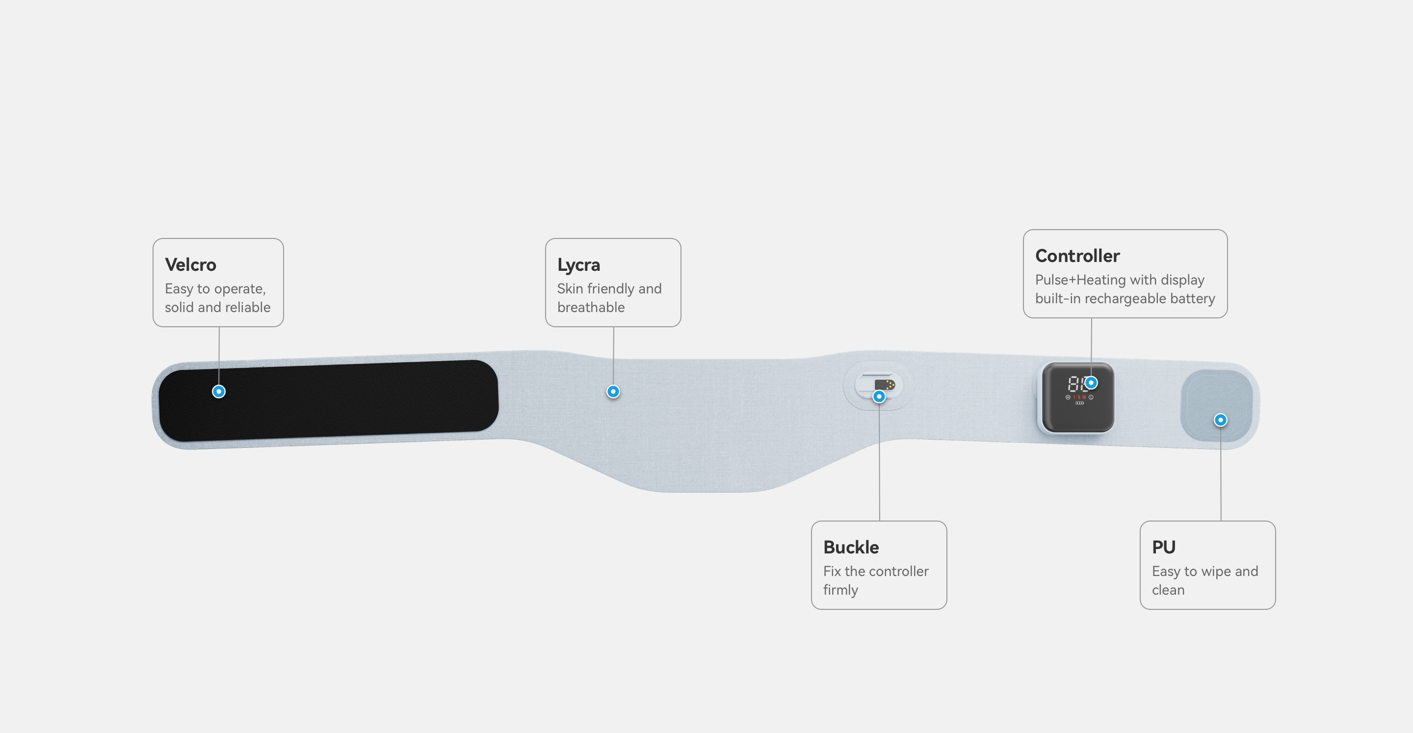Through EMS(Electrical Muscle Stimulation) and heating technology, this heating massage belt is designed with conductive coating as electrodes to replicate regular exercise & massage.It generates safe and gentle electrical pulses on your body at regular intervals, to massage backside of your waist, and train frontside of your Abs.